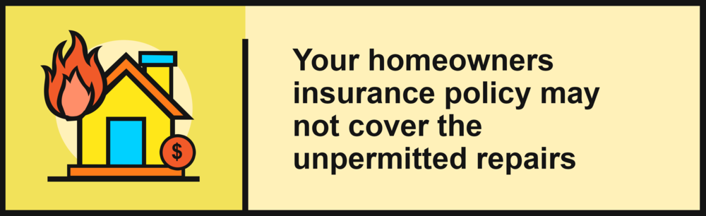 Another area of concern is that any unpermitted additions may not be covered, and even violate your insurance policy. It is especially concerning if an accident or disaster occurred in that part of your home. If there's been a house fire caused by faulty wiring due to poor electrical work, or if someone fell and seriously injured themselves you could be facing a costly nightmare.